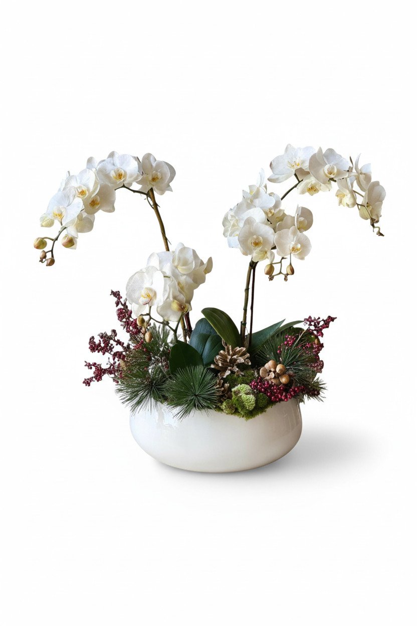 Every detail of this orchid centerpiece has been thoughtfully crafted to create a harmonious and balanced presentation. The pristine white petals offer a sense of tranquility, while the sublime arrangement ensures it stands out as a statement piece. This product is designed to complement sophisticated interiors, making it perfect for modern, minimalist, or traditional aesthetics alike.