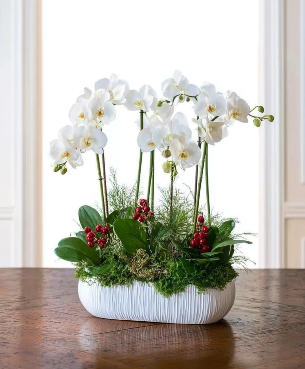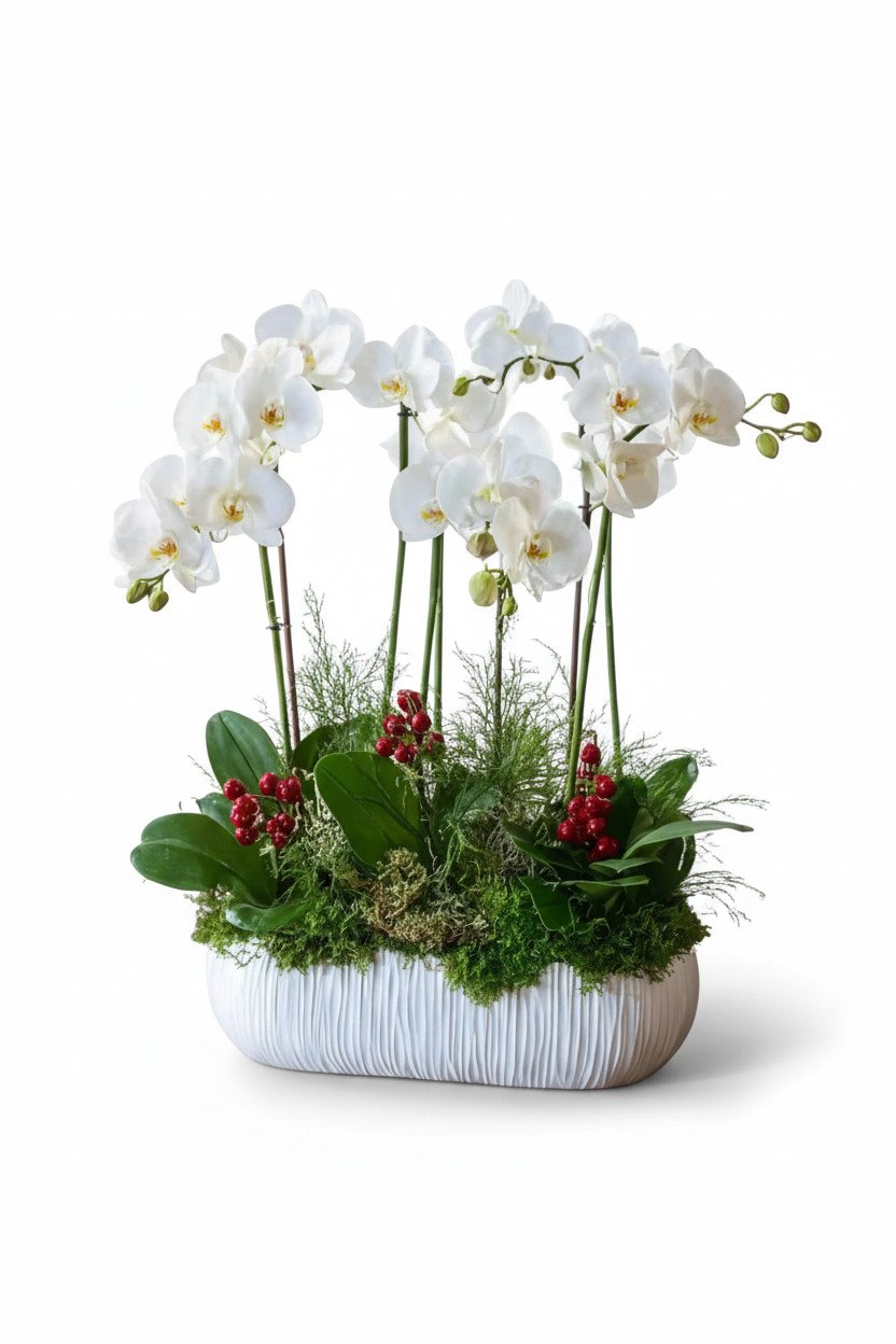 This timeless arrangement features elegant white Phalaenopsis orchids rising gracefully from a bed of lush green moss and delicate ferns. A sophisticated and long-lasting gift that brings classic holiday charm to any home or office.