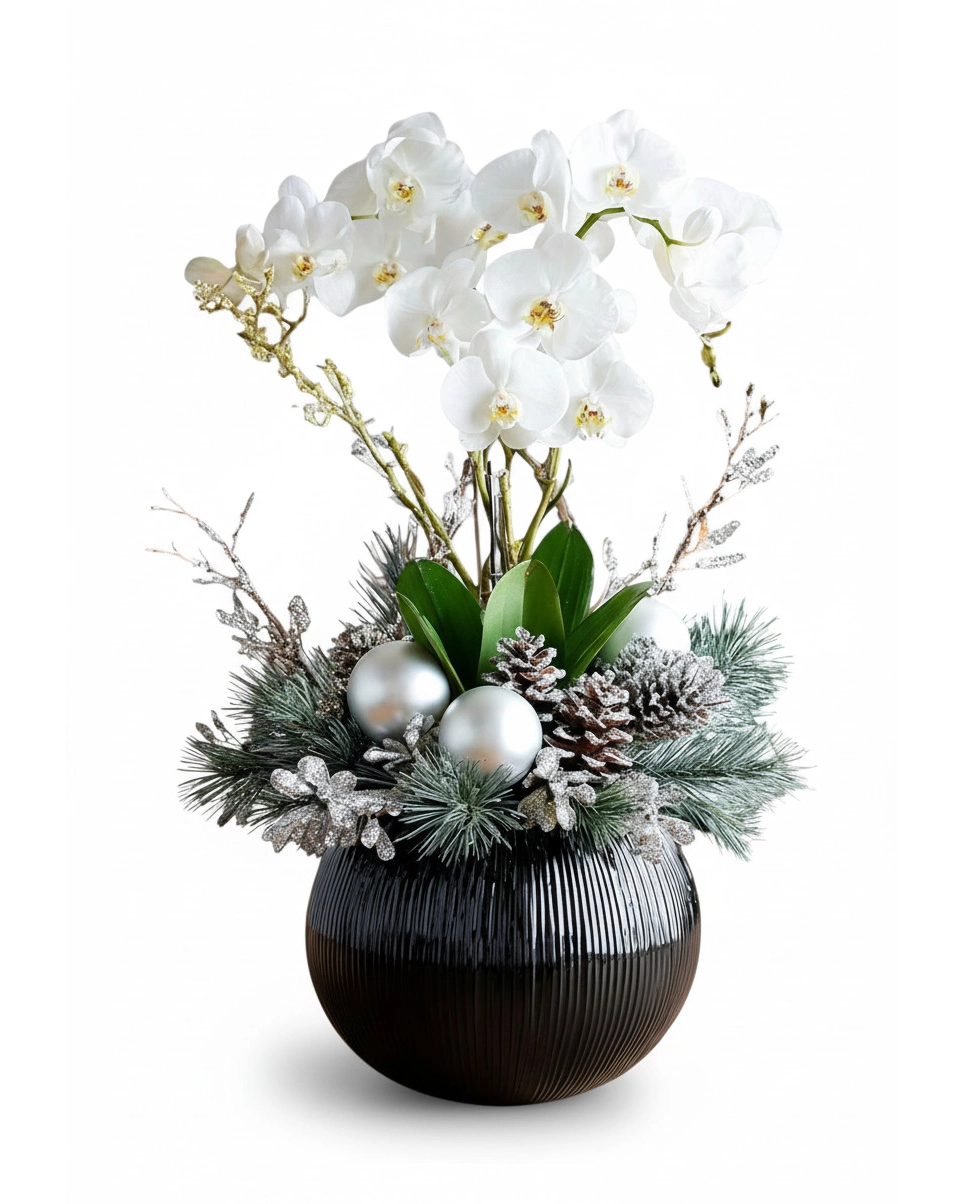 Crafted with expert attention to detail, the Winter Glow centerpiece combines natural elements with a harmonious design that ensures versatility. The white orchid blooms stand as the focal point, paired seamlessly with evergreen sprigs and delicate accents to deliver a look that feels fresh, crisp, and restorative. Its neutral yet striking palette complements holiday themes without overwhelming other decorations, letting the centerpiece effortlessly blend into any setting.