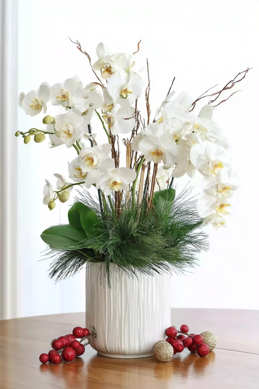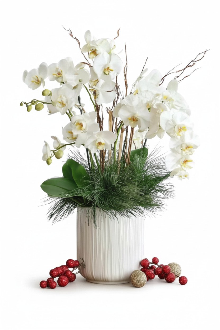 This serene and elegant arrangement features a graceful cascade of white Phalaenopsis orchids, a perfect centerpiece to bring a touch of calm, natural beauty and holiday cheer to your home.